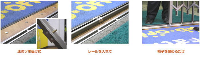 出入りをする掃き出し窓や店舗出入り口に取り付ける際には・・・ つまずく事の無いようにレールを取り外す事が出来ます。 取り付け・取り外しは、道具を使わないで両手でカンタンに出来ます。 段差を無くす事によって、お体の不自由な方も安心して通る事が出来るようになります。 店舗でご使用の場合には、台車などの通り抜けがスムーズに出来ます。